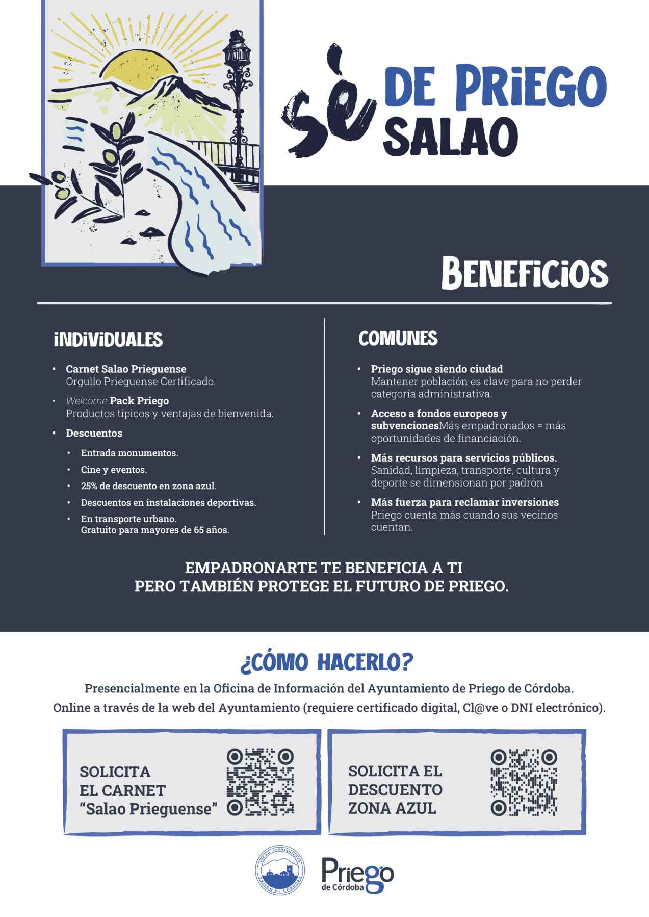 La campaña también vincula el “carné de prieguense salao” —en formato digital y físico— a distintas ventajas, como entrada gratuita a monumentos municipales (acreditada con el carné), descuentos puntuales para eventos culturales e instalaciones deportivas, y transporte urbano gratuito para mayores de 65 años empadronados. El carné se solicitará mediante formulario y se podrá retirar, entre otros puntos, en la futura oficina de turismo prevista en la calle Río.